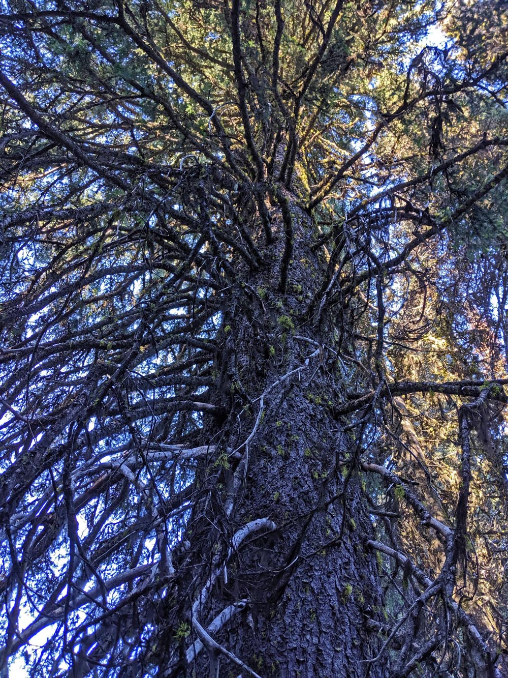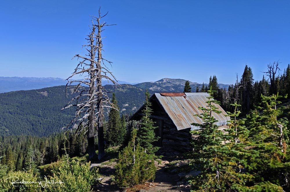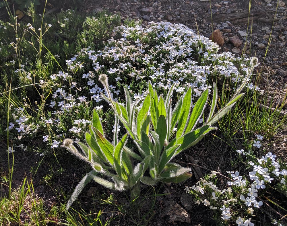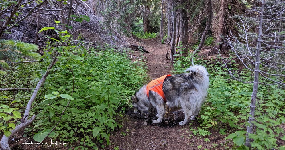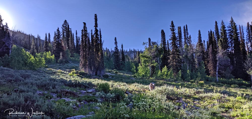 Right away we’re treated to an abundance of purple and blue – asters (daisy family) and Payette penstemon.Nearby and a bit higher in elevation, lupine are just blooming.Asters and lupine take over the center of an old, abandoned logging road through a forested section of the route.Early morning sun breaking through the trees highlights yellow owl’s claws mixed with purple-blue penstemon.Between climbs, we enter a level section of single track through dense trees where Conall finds a trickle of fresh water burbling up from an underground spring right beside the trail.As Conall’s drinking I look around and am delighted by the size of this tree just off the trail, a majestic matriarch shading much younger relatives.The tree is so tall I can’t capture all of it in a photo.Just past the level stretch of trail we enter open meadows dotted with boulders and trees, lush with emerging wildflowers and grasses, the sun rising above the eastern ridge of a big, open bowl.Payette penstemon on an open slope with lupine and yellow cinquefoil, backed by a grove of aspen.Payette penstemon – so blue! – with yellow cinquefoil.Climbing through the boulder-strewn meadow, Conall shows the way as we’re about to enter another large meadow. Our route will soon have us traversing the front of that rock-strewn slope in the distance.Open grassy meadow that will soon be full of lupine and other wildflowers as well. We’re at roughly 7,000 feet in elevation now. We’ll pass through some trees on our way to that distant slope.Shooting stars – one of the prettiest of the early wildflowers – growing beside a stream under the trees.Single-track trail emerging from the trees after crossing the stream.Unsure what these low-growing, shade-loving white flowers are, but they remind me of baby’s breath.Now we climb up and across the scree slope just as the sun begins to find it. The lower section is lined by mountain bluebells, elusive yellow Columbine, and mountain lilac shrubs (I think). And mosquitoes! So thick here, thankfully not bad everywhere else.Columbine and penstemon among the boulders.Conall amuses himself with boulder hopping in the scree field. Note the half moon in the sky above him.Just past the scree field, still climbing looking up toward the top of the ridge and the true summit, the trees and wildflowers find purchase among the boulders. We’re at roughly 7,400 feet now. At the base of a rock face well shaded from the sun, Conall finds the last remaining bit of winter’s snow and enjoys a few bites.Something I only see growing here in this shady cliff base are these magenta-colored Indian paintbrush. Usually the paintbrush are orange. Mixed with the magenta paintbrush are a few yellow heartleaf arnica and baby-blue Jacob’s ladder.We’ve reached the “false” summit at 7,600 feet (the trail doesn’t visit the true summit at 7,800 feet), where the views open up for miles in all directions. This old log cabin with rusty metal roof adds character to the northwest view.Conall tries stalking the pika atop the rocks on the small hill to his left, but the pika wisely dives underneath them. Looking south, there’s still some snow on distant mountains, and the weather’s changing, clouds holding some much-needed rain coming in from the southeast.The view of forests, lakes, valleys, mountains and interesting cloud formations to the south, from a shoulder just below the summit.Working our way back down the mountain now, along a single track trail, wild roses and fuzzy bistort flowers frame the view to the southwest.This section provides gentle downhill single-track trail through open meadows fragrant with wild roses and phlox and expansive views westward.The delicate white flowers of low-growing phlox give off a spicy scent. Not sure what the taller green-leafed plant is, but the morning sun nicely highlights its fuzziness.Along the way, some of the more typical orange-colored Indian paintbrush.Nearly back to our starting point, a small creek provides water for this showy display of wild roses.Conall jumps back up onto the trail after getting a drink in the small creek running under the foot bridge. Roses, bistort and bluebells thriving alongside the creek.Just above the parking lot, some mountain hollyhock almost as tall as me.Parting shot: a bee collecting dog rose pollen.
