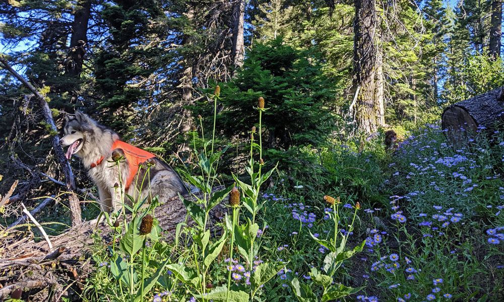 The odd behaviors start early on. As we climb through a steep but mostly open area about a mile from the car, Conall stops to sniff an Indian paintbrush flower leaning over the trail. He sniffs that flower multiple times, sometimes looking up briefly to scan the trail ahead before sniffing again. It’s odd that he takes so much time and seems puzzled or concerned by what he smells. I eventually step around him but am wondering if he smells another animal that recently used the trail, brushing by the flower. Conall quickly catches up and passes me but doesn’t dash to catch up to Finn, who has taken lead position several yards ahead. Conall finds huckleberries beside the trail, so we take a break to graze.