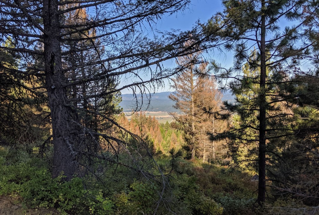 Several bugs, actually. And like you or I catching a bug – a cold, the flu – the forest in many places is looking and feeling sick, many trees with brown needles, or branches devoid of needles altogether. The photo above was taken August 4, 2019 in the Payette National Forest, looking west through and at some of the brown, damaged trees common in this section of the forest.