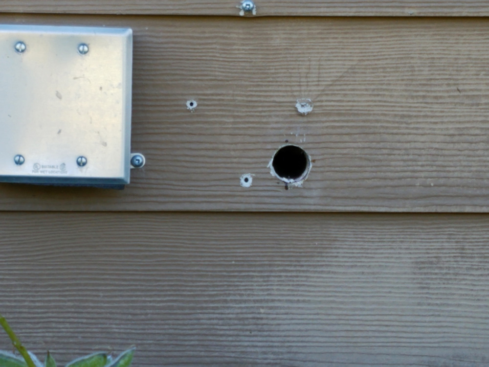 When my house was built, I had a propane-powered generator attached in this spot. I quickly decided the generator was overkill and sold it. The pipe and metal box were installed for the generator, as was the hole to the right. Years earlier I noticed bees flying in and out of the hole so I covered it with duct tape. Apparently over the past winter the tape had come off and these birds saw the perfect place to build a nest and raise a brood. The interior side of this wall is my garage, so I never heard them.