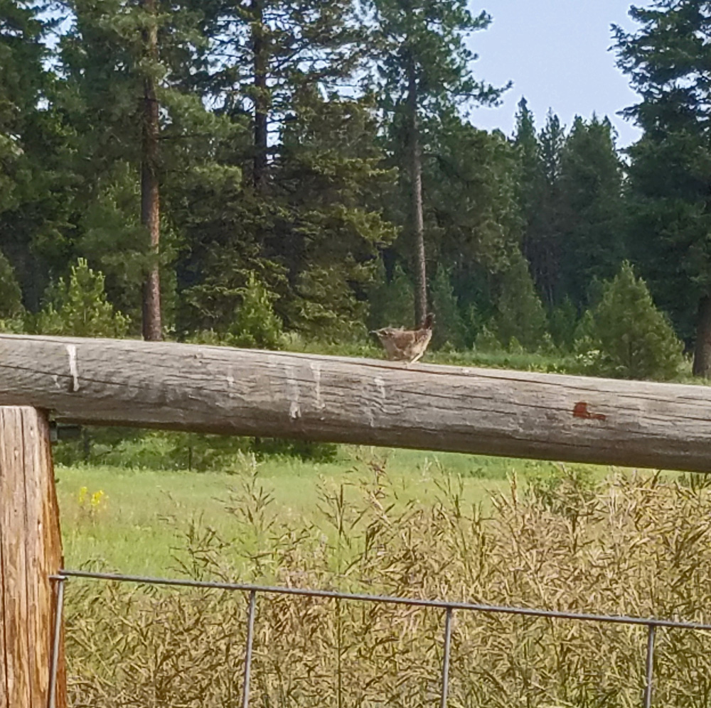The next day I’m out in the yard again, in the fenced area on the other side of the house. Bird movement catches my eye. I notice two tiny brown birds flitting about the corner of the fence where some old wood tomato plant support boxes have been stacked for several years. Sometimes the birds land on the wire below the top horizontal post, other times on the post. One takes off and quickly lands, the second following close behind. Then I hear the same loud bird chatter as yesterday. Ah – more fledglings! Looking up, I see mama on the roof again, noisily monitoring. I pull my phone from my pocket and take some photos. Later, editing them on my computer, zooming in, I see that one of the two birds flying near the fence has feathers sticking straight up from the top of its head.