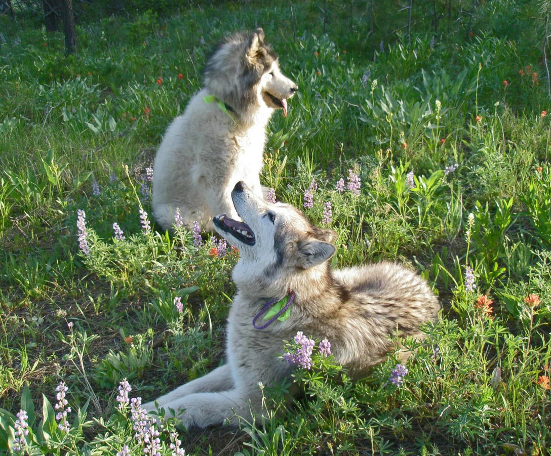 Featured image: Maia (in front) and Meadow basking in the sunshine among forest wildflowers in Idaho, 2007.