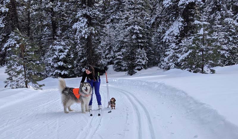 After skiing nearly an hour, bumping into no one, Conall spies a tiny dog up ahead, followed by its human. Tiniest dog I’ve ever seen out here. A Doxie (Dachshund), with typical long body, short legs and long floppy ears. (The dogs are allowed off-leash here; it’s a major attraction, for which we pay an extra $25 for a dog ski-area pass. In a flip from the more typical scenario, it’s the rare leashed dogs that cause issues.)