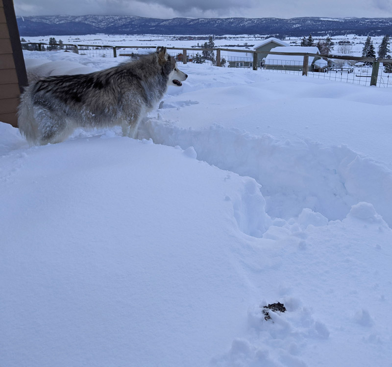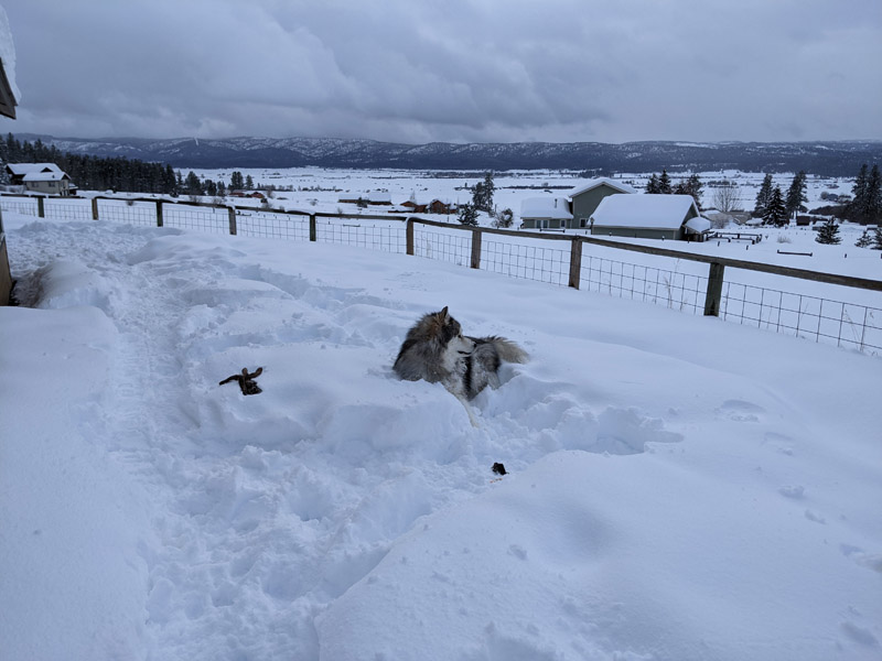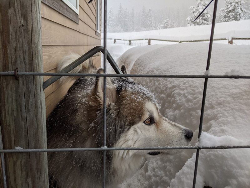 As much as I love snow, I’m about ready to cry “Uncle!” I don’t want to see my yard fence disappear underneath the snow. I remember one prior winter, before Finn and certainly before Conall, when the snow was this high. I remember worrying that my female malamutes, Maia and Meadow, might just walk right over the top of the fence and wander the neighborhood, but they never did. That’s when I understood that they knew the yard was their territory, the fence their boundary, and they were happy to stay inside the line where it was safe.