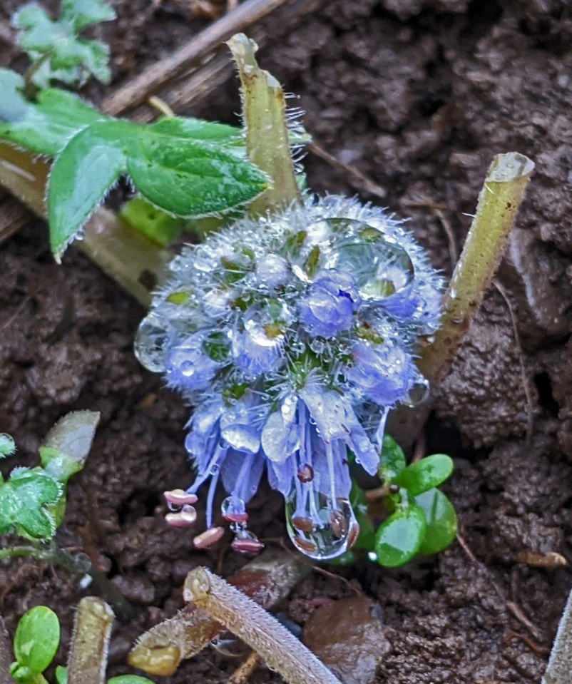 Ballhead waterleaf flower covered in raindrops, nearby leaves eaten by…a deer?