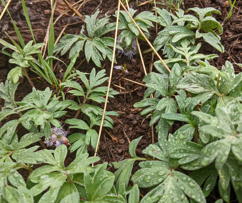 Ballhead waterleaf plants, leaves uneaten, flowers hiding