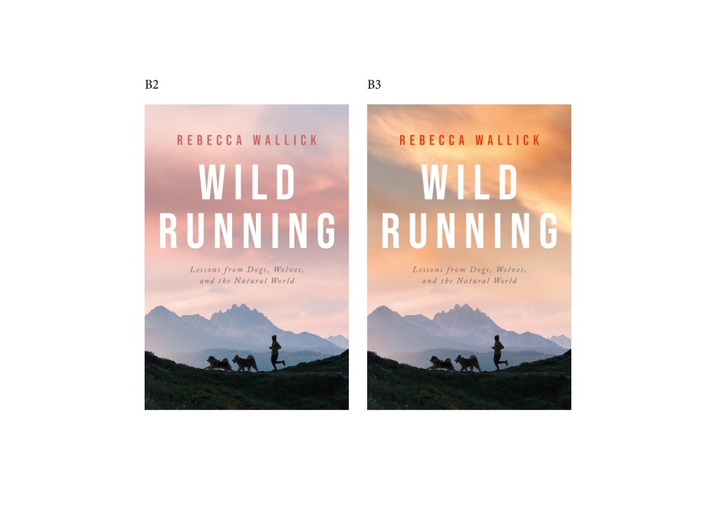 A few days later, two mock ups of the front cover arrived in my inbox: one with pink sky, one with orange. Both had an updated silhouette of two dogs + runner.