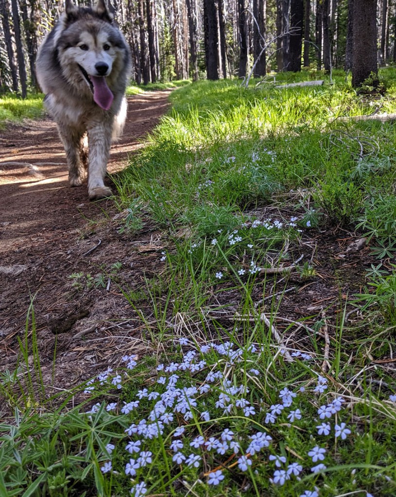 6-24-19: Run: 7 mls w/boys on Ruby Meadows trail, visiting girls’ cairn (needed to rebuild a bit but found it!); so pretty, phlox, lupine and violets alongside trail, not too dusty, no one else there; Conall a bit nervous, just like Maia was when we saw the wolf so like to think a descendant of that wolf was watching us today.