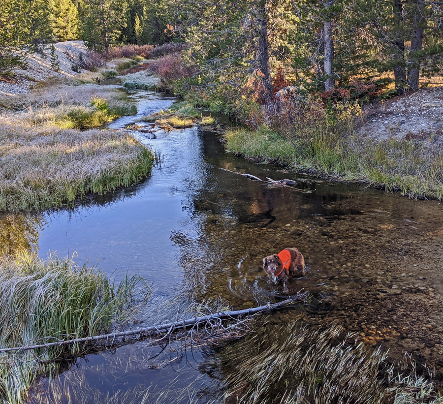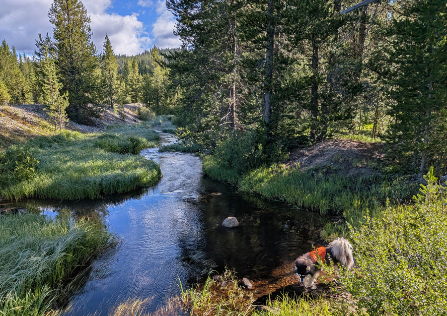Feature photo: Chann on the Ruby Meadows trail August 8, 2025, the bright morning sun filtering through the trees, just as it was the morning Maia, Meadow and I saw the wolf.