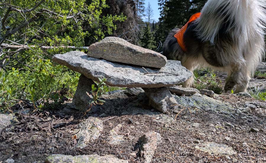 Chann and I visited three cairns early this summer: two on Brundage, and one on Goose Creek. All were where I’d left them, with maybe one or two stones fallen off their tops. My heart swelled with happiness when I found each of them. I quickly made repairs, added some of Finn’s ashes, and took photos.