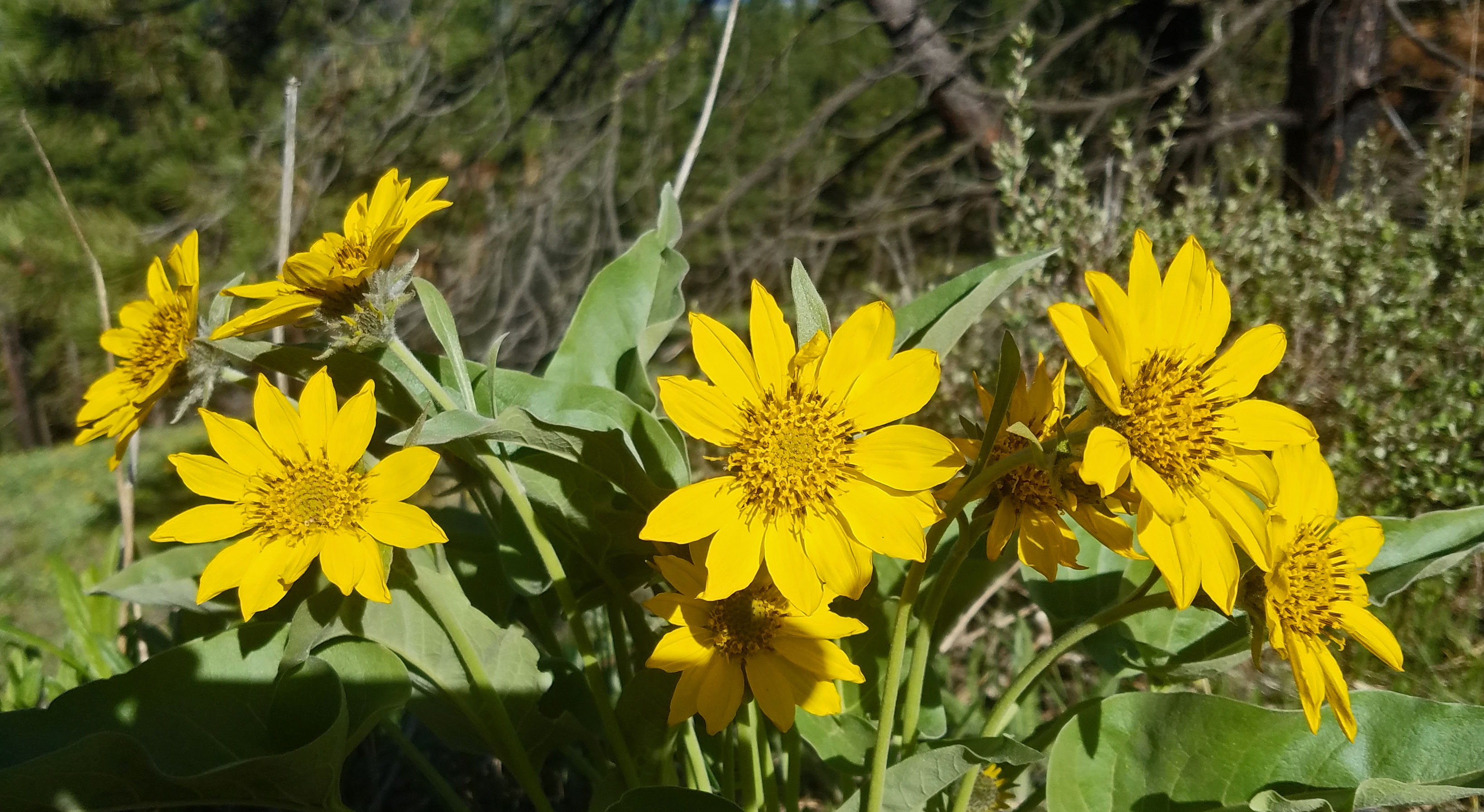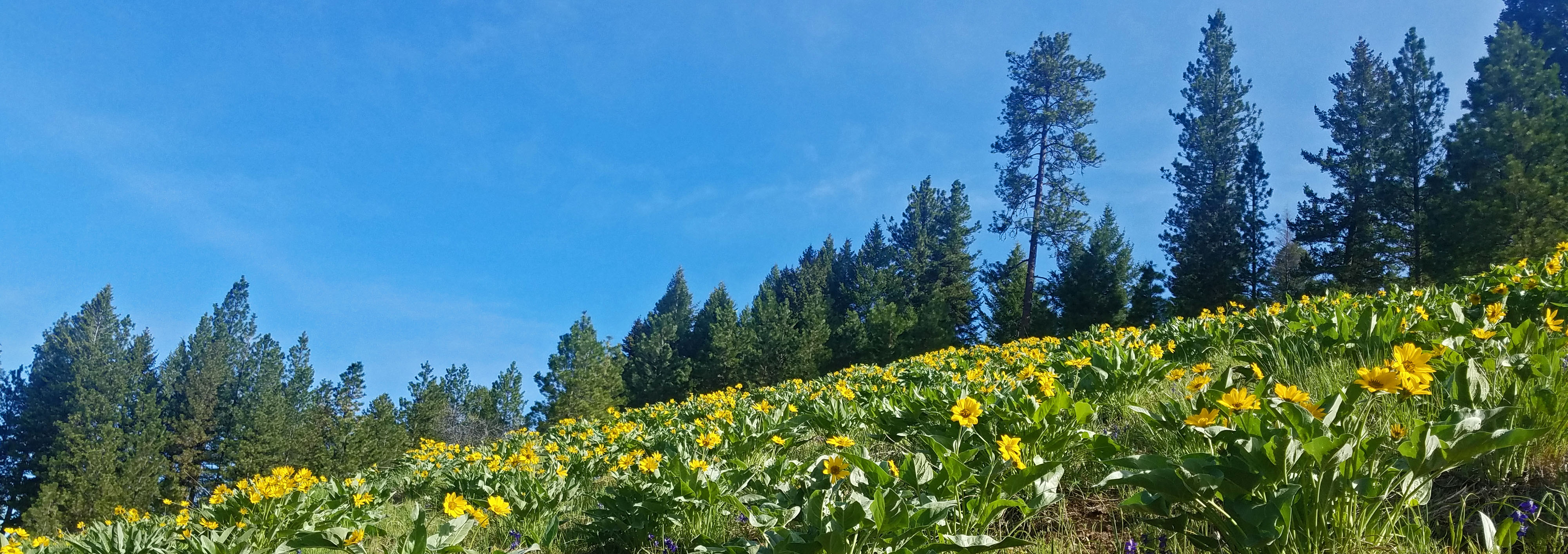 Mountain bluebells; Douglas’s grasswidow; sunflowers (arrowleaf balsomroot); ballhead waterleaf; larkspur; a hillside of sunflowers; avalanche (or glacier) lilies.